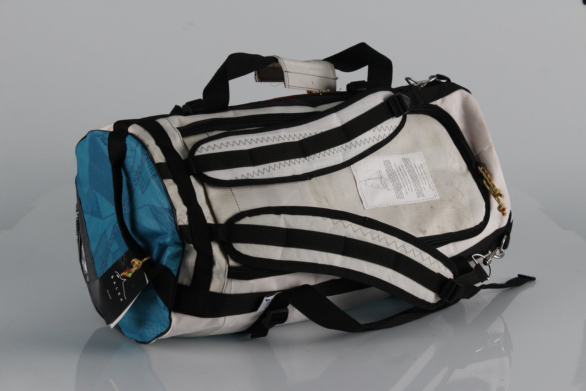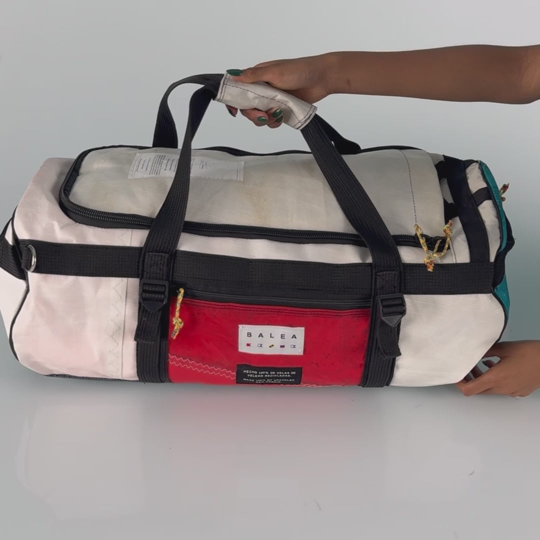 Esta bolsa está hecha de tela de vela reciclada que proviene de una vela que ha terminado su vida útil de navegación. Tiene historia y aventura en su tela.